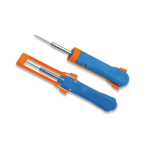 Conforme mostrado nas imagens aqui, a ferramenta de extração é inserida na parte frontal do invólucro do conector. Em seguida, o terminal é extraído da cavidade do alojamento no lado oposto do conector.