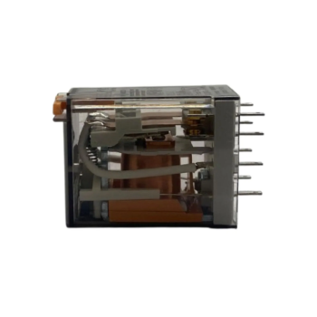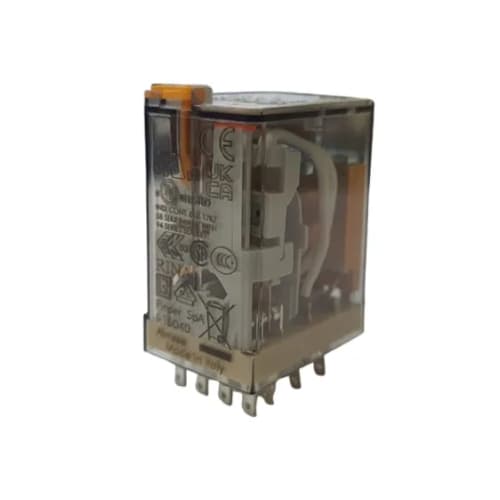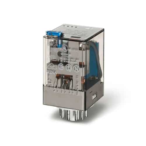 Relé industrial de encaixe com 2 contatos reversíveis (DPDT) e tensão nominal da bobina 110VCA.