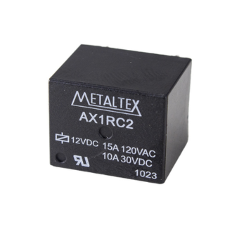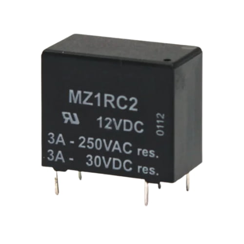 Relé miniatura de potência, selado, 1 contato reversível (SPDT) e tensão nominal da bobina 12VCC. Capacidade de comutação de 15A @ 120VCA – 10A @ 250VCA – 10A @30VCC. Terminais para montagem direta em PCI.