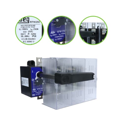 As chaves RFW seguem as normas internacionais de desempenho de produto IEC 60947-3 e IEC 60947-1 e incorporam bases porta-fusível tipo NH para os tamanhos 000, 00, 1, 2 e 3.
