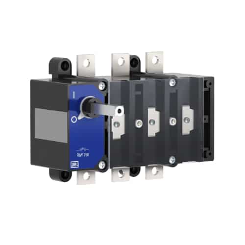 Disponíveis nas correntes de 100 A, 160 A, 250 A, 400 A e 630 A, as seccionadoras rotativas RFW possuem acionamento rotativo, feito por meio de manopla direta frontal, ou pelas manoplas externas para porta de painel – estas últimas fornecidas como opcionais.
