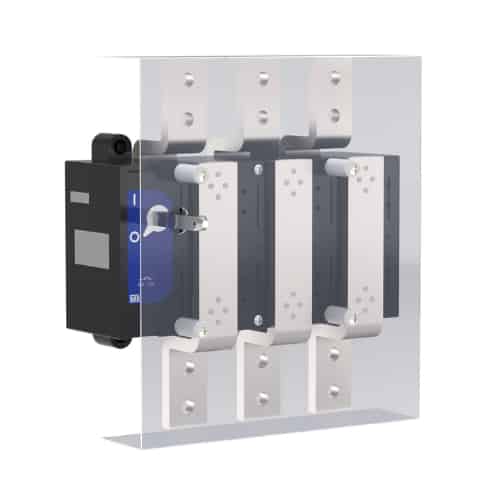 O acionamento é rotativo, feito por meio de manopla direta frontal ou pelas manoplas externas para porta de painel. Estas últimas são fornecidas como opcionais. A manopla para porta de painel permite travamento por cadeado na posição desligado.